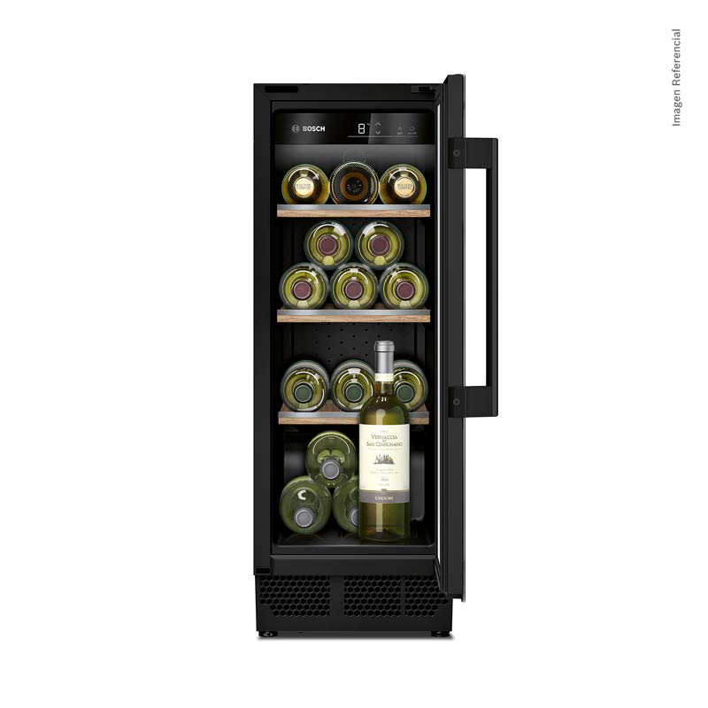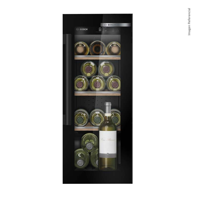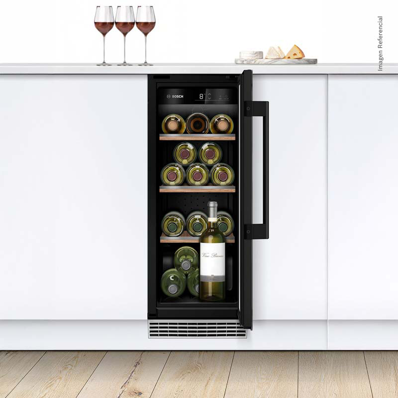 La KUW20VHF0, de instalación integrable, ofrece capacidad para 21 botellas y 3 bandejas de madera. Su puerta con triple cristal y filtro UV, junto con una zona de temperatura ajustable (5–20 °C), protege cada botella de la luz y el calor. La iluminación LED suave y su diseño sobrio realzan cualquier cocina o sala gourmet, brindando un equilibrio perfecto entre estética y precisión Bosch.