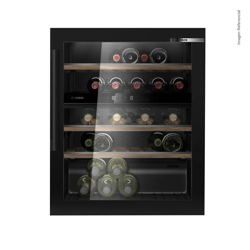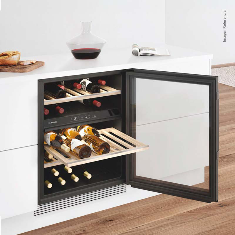 La KUW21AHG0, de instalación integrable, ofrece capacidad para 44 botellas y dos zonas de temperatura independientes (5–20 °C) para conservar tintos y blancos en su punto perfecto. Con 3 bandejas de madera, puerta de cristal negro con triple vidrio y filtro UV, e iluminación LED envolvente, combina precisión térmica, estética minimalista y el refinamiento característico de Bosch.