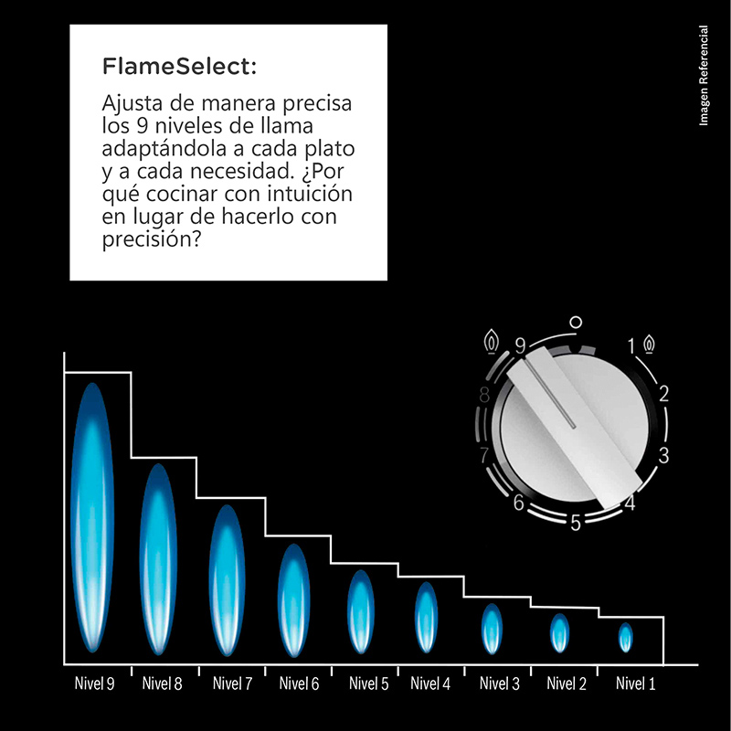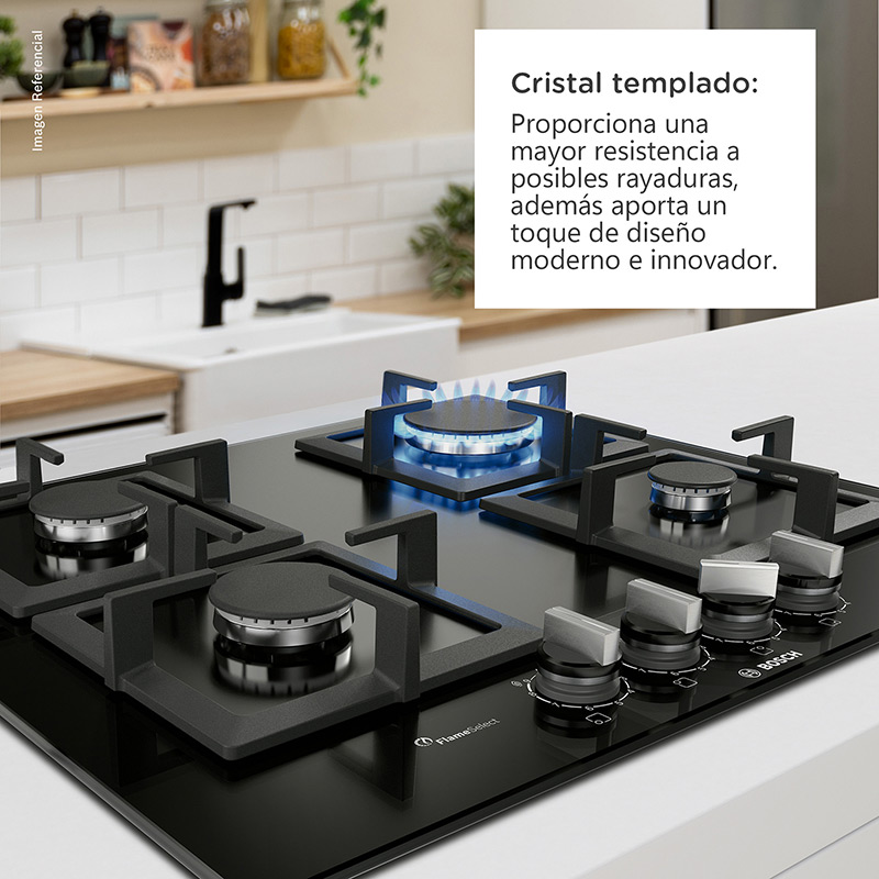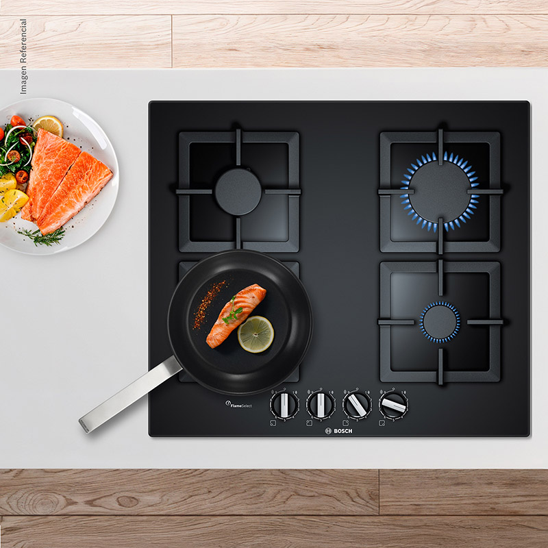 Disfruta de una cocción precisa con la encimera a gas Bosch de 60cm equipada con FlameSelect, la tecnología que revoluciona el control del gas. Gracias a sus niveles de llama predefinidos, obtendrás resultados consistentes, seguros y profesionales en cada preparación. Su superficie de vidrio templado negro le brinda un aspecto moderno y sofisticado que ofrece control y durabilidad. Diseñada para quienes exigen rendimiento y flexibilidad, integra cuatro quemadores a gas. El control se realiza mediante las perillas ergonómicos, con encendido automático integrado y sistema de seguridad por si la llama se apaga accidentalmente evitando fuga de gas.