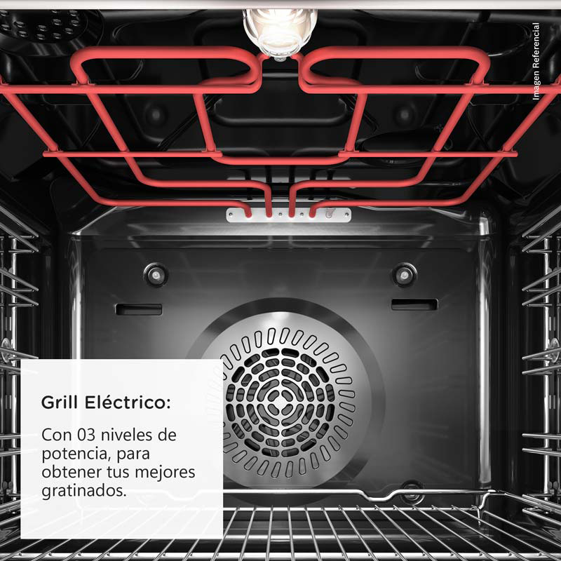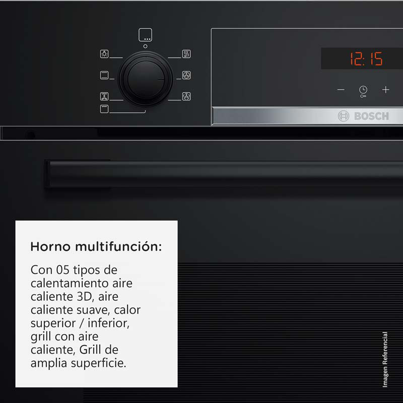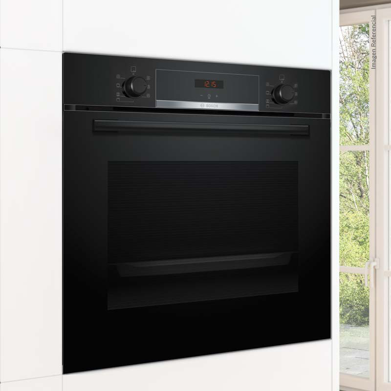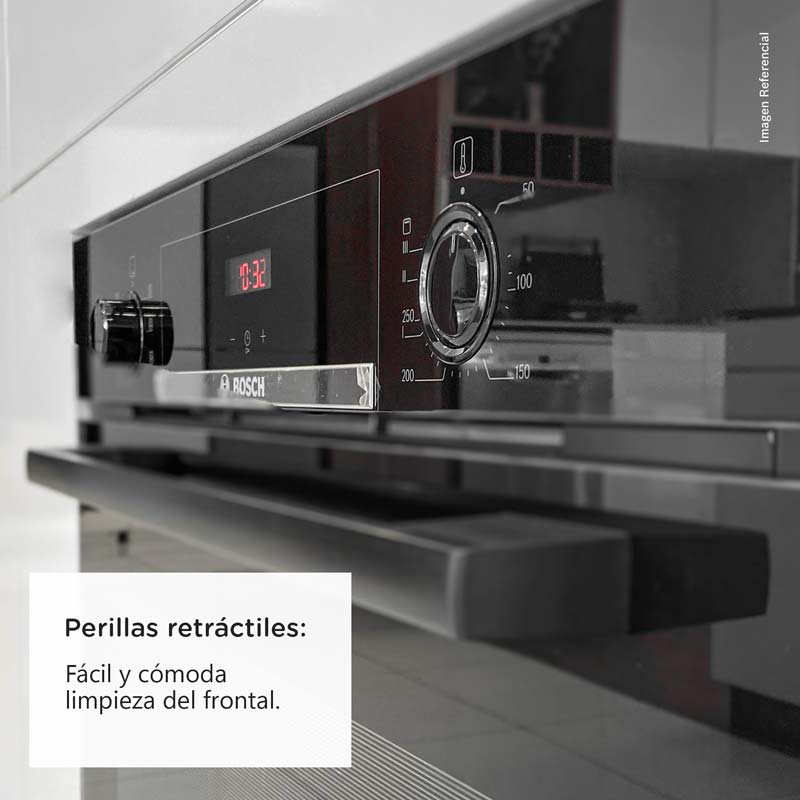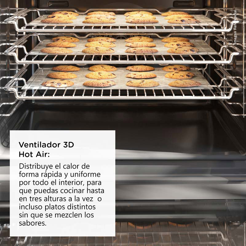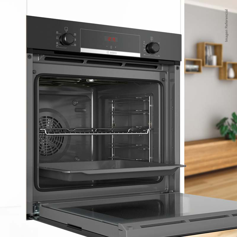 Horno empotrable de 71 L con 5 funciones, incluyendo 3D HotAir para una distribución uniforme del calor. Su panel combina pantalla LED con timer digital y perillas retráctiles, fáciles de limpiar y seguras para niños. Incluye 1 bandeja y 1 parrilla de serie para mayor practicidad. El sistema de precalentamiento rápido acelera el cocinado. Diseño elegante en color negro, ideal para cocinas modernas.