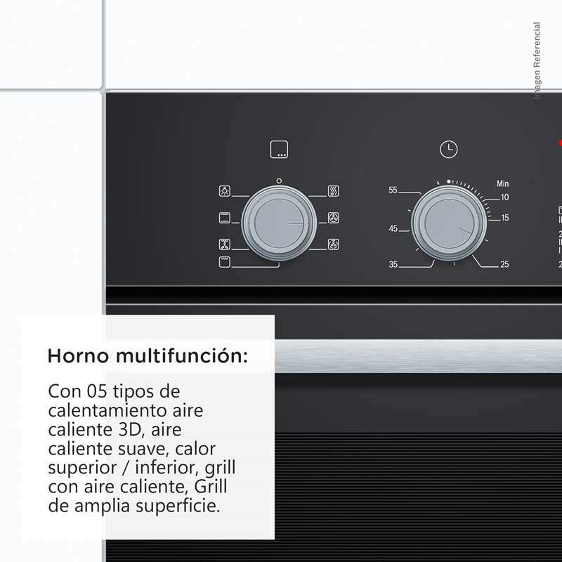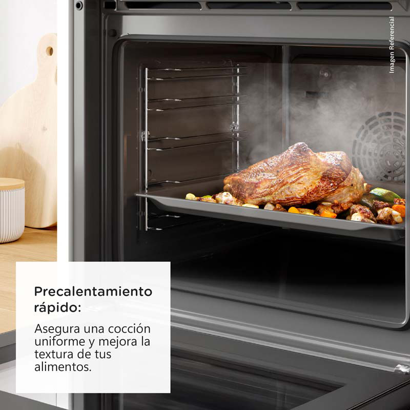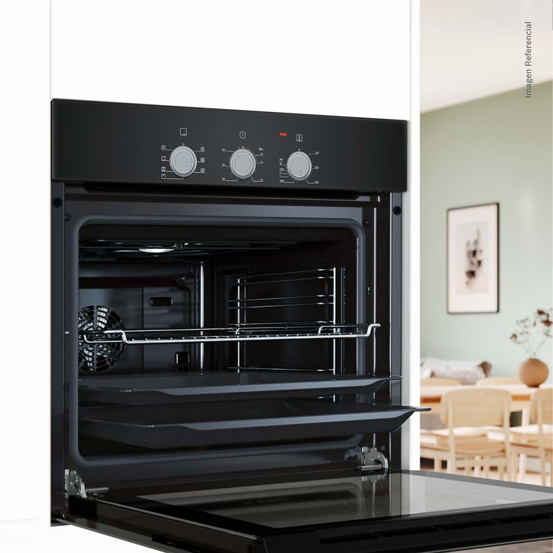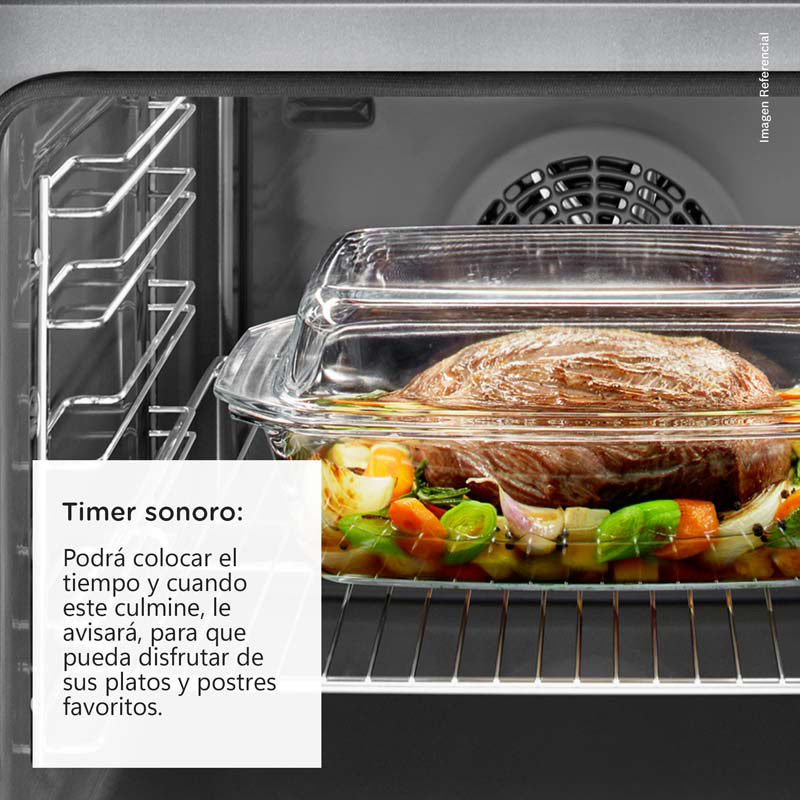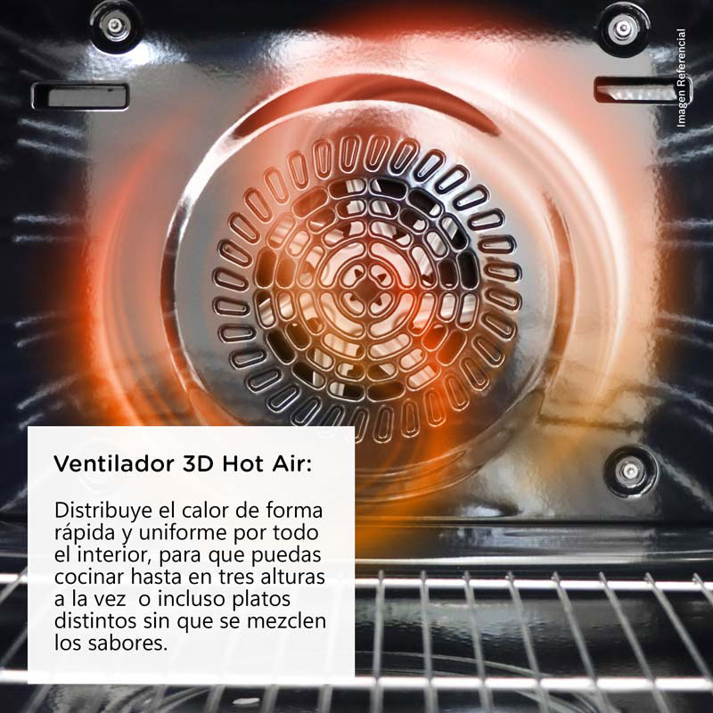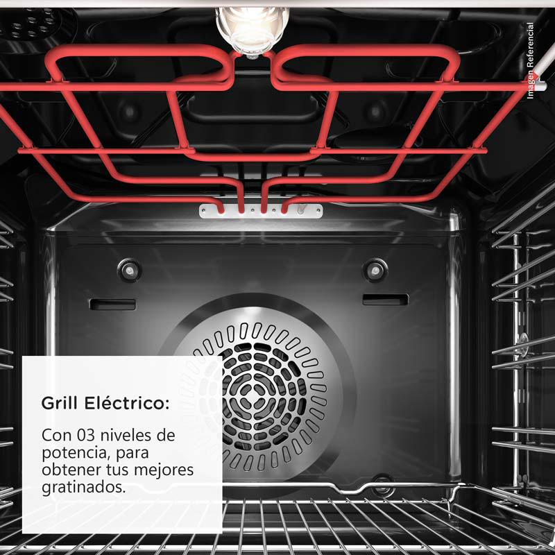 Dispone de 5 modos de calentamiento (aire caliente 3D, calor superior/inferior, grill con ventilador, grill amplio y calor inferior) con un rango de temperatura de 50 °C a 270 °C, brindando versatilidad para todo tipo de preparaciones.
