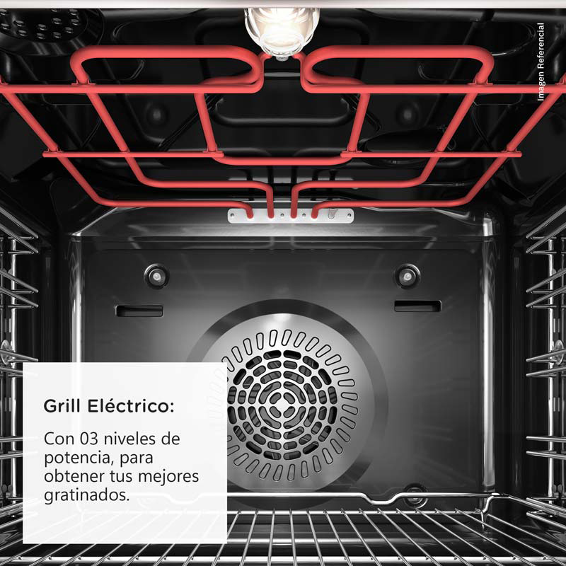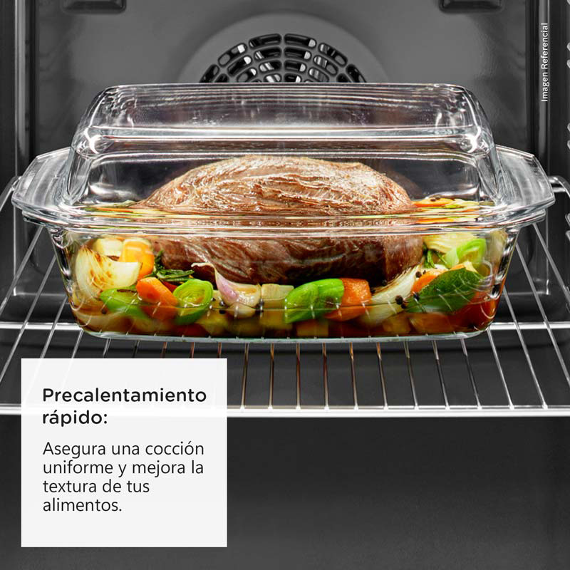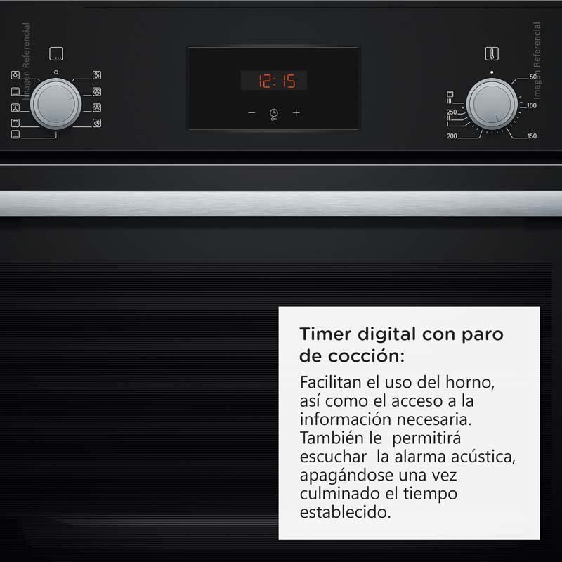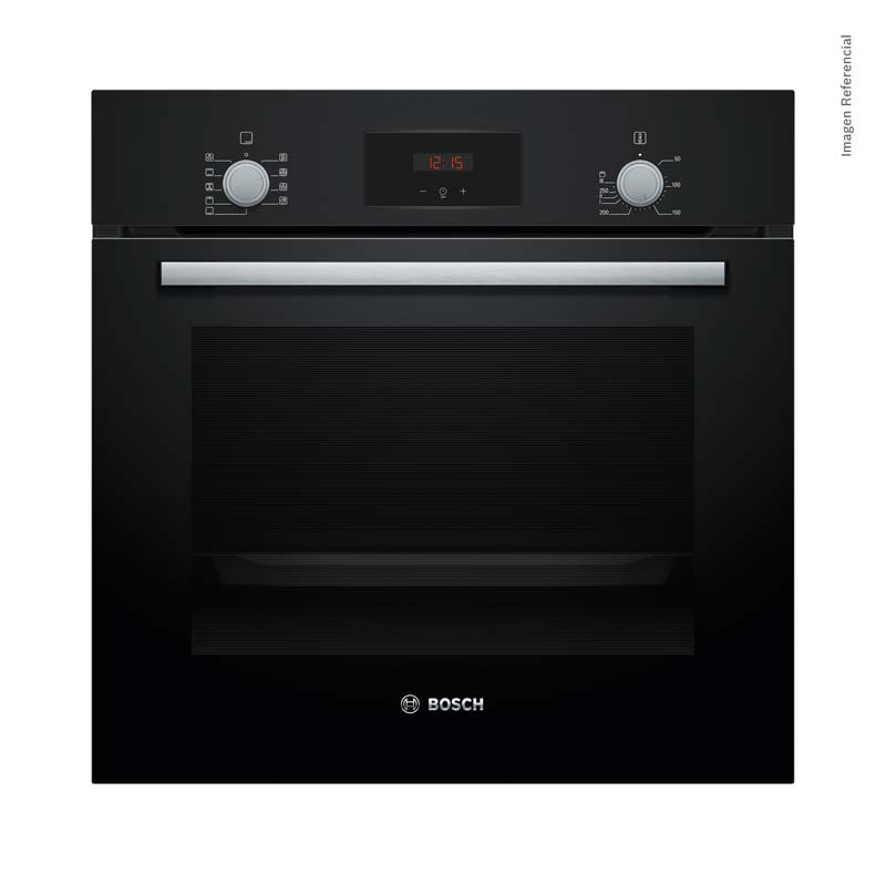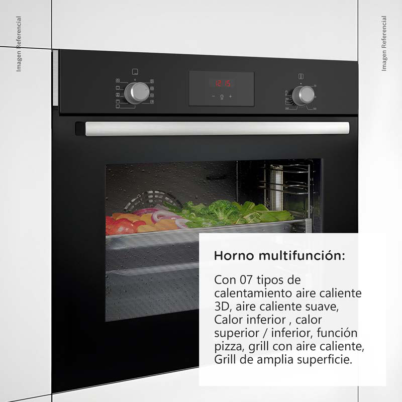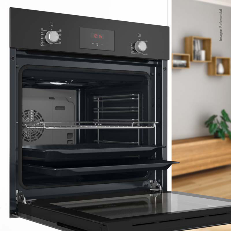 Horno empotrable Serie 2 capacidad de 66 LT. Cuenta con 7 modos de cocción (aire caliente 3D, grill, calor superior/inferior, función pizza, “aire suave”, etc.) y un rango de temperatura de 50 °C a 270 °C, para gran versatilidad culinaria. Su diseño incluye puerta con doble vidrio desmontable, bloqueo de seguridad para niños, guía telescópica de 1 nivel y panel con display LED y mandos giratorios.