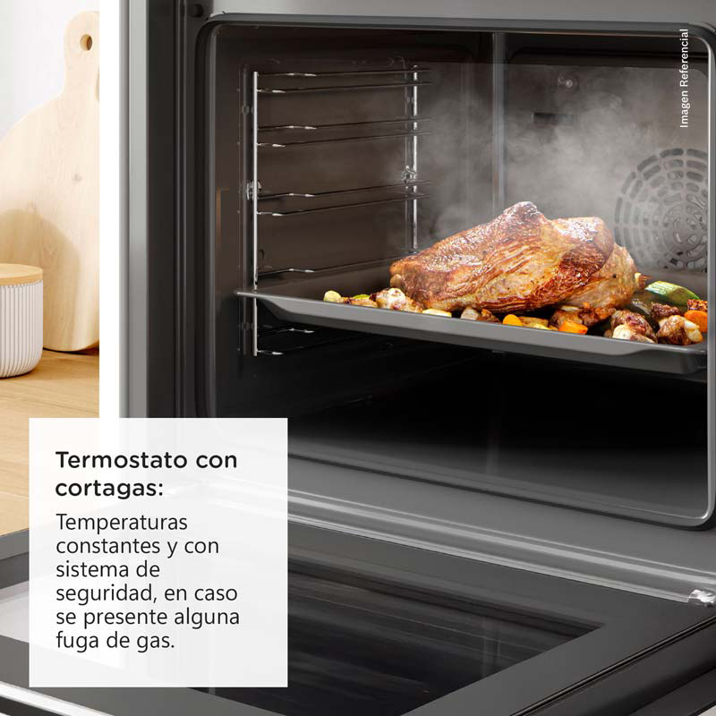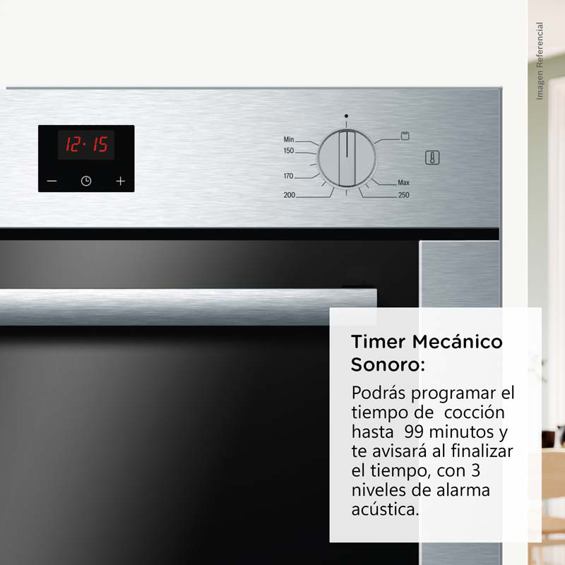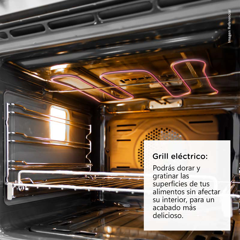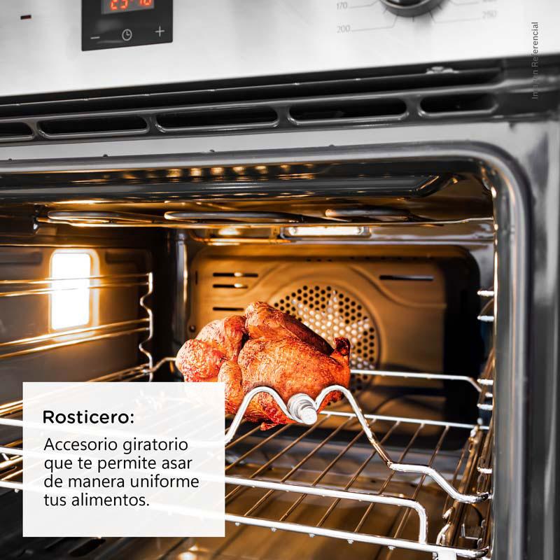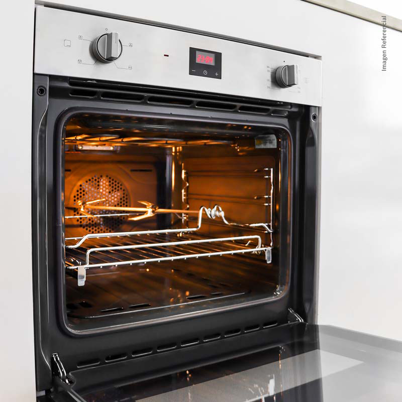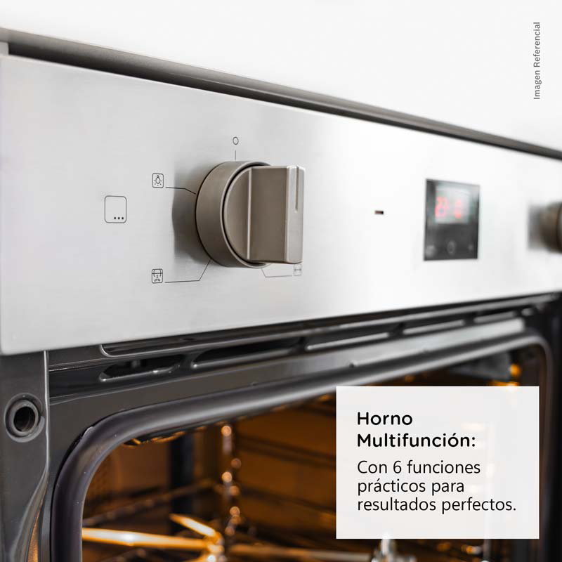 Horno empotrable a gas de convección con capacidad de 60 L, con grill eléctrico integrado dentro de sus 06 funciones para una cocción versátil. Su Timer digital sonoro te avisará una vez concluido el tiempo preestablecido. Incluye 1 bandeja y 1 parrilla y 1 riel telescópico. Además de opción para rosticero giratorio. Su pared catalítica facilita la limpieza del interior.