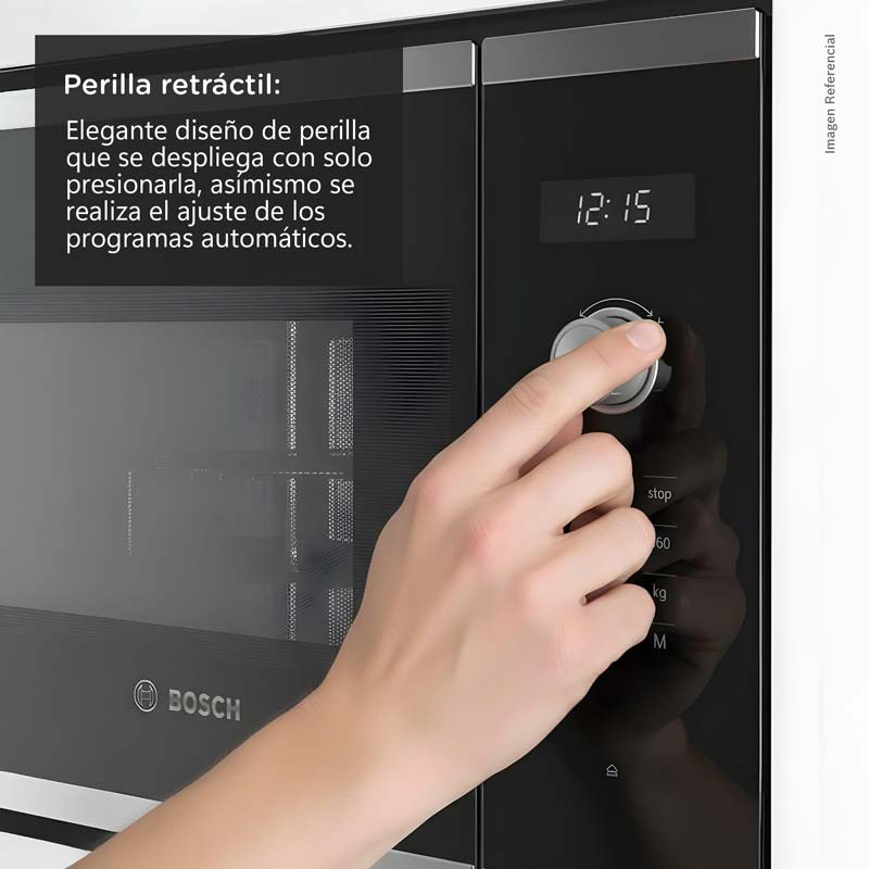 Nuestro horno microondas Bosch ofrece una potencia máxima de 900 W y un grill simultáneo de 1 200 W, permitiendo combinar funciones para gratinar mientras se calienta. cuenta con 5 niveles de potencia (90 / 180 / 360 / 600 / 900 W) y modos combinados de grill + microondas para mayor flexibilidad. Dispone de 8 programas automáticos, reloj electrónico, display LED con luz blanca y mando ocultable para una interfaz limpia y fácil de usar.