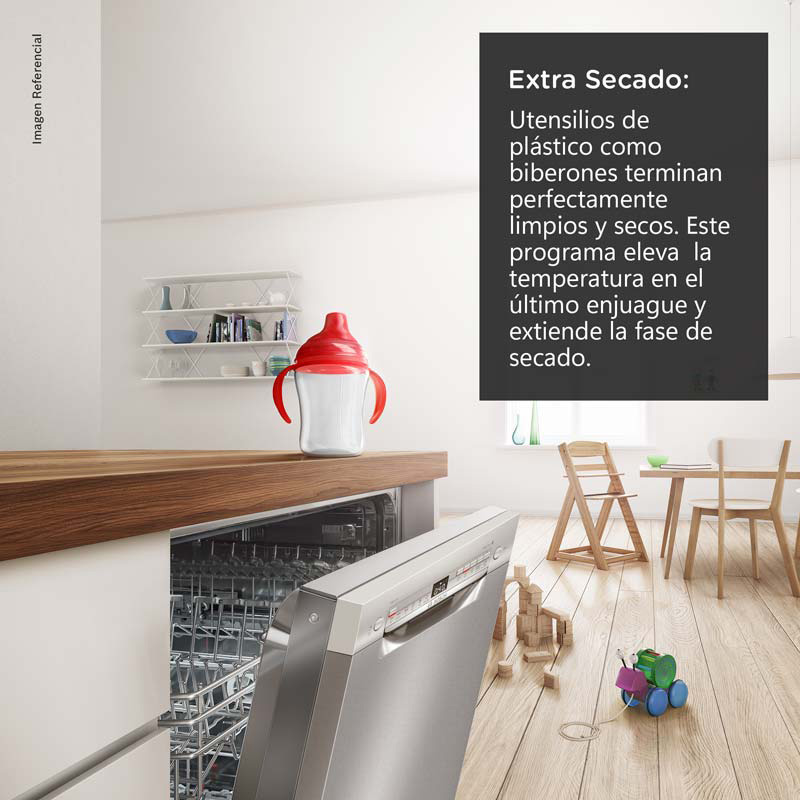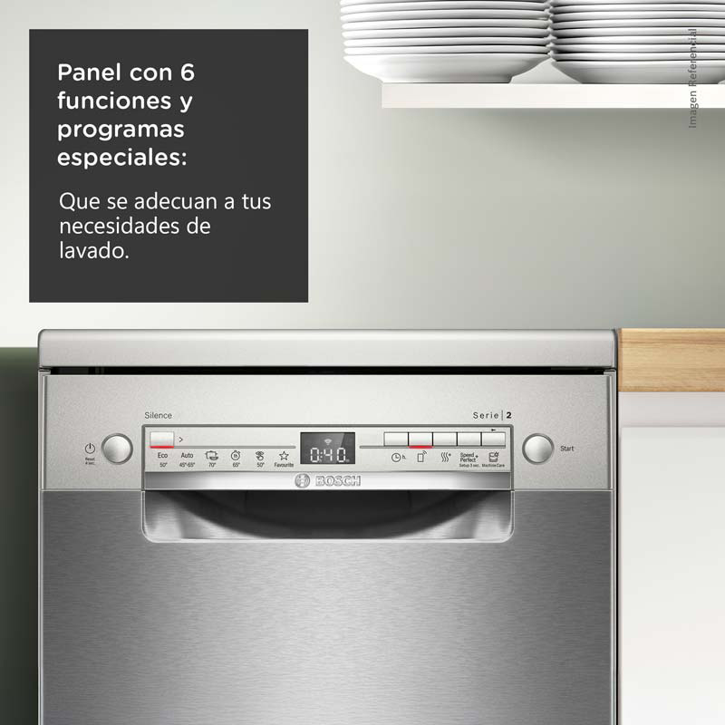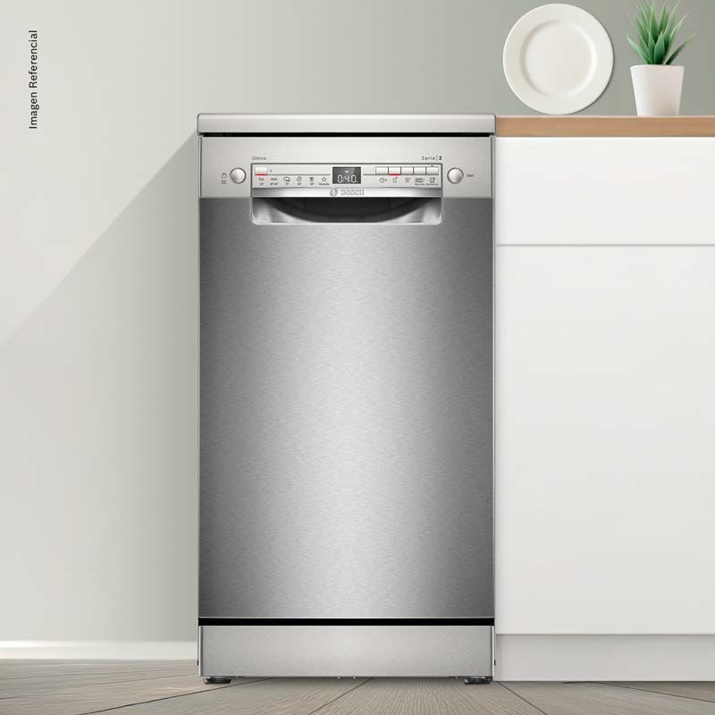 Lavavajillas compacto de 45 cm con capacidad para 10 servicios. Con HomeConnect, permite monitorear el lavado y gestionar el ciclo desde el celular. Ofrece 7 programas y 3 funciones especiales, como Extra Secado y SpeedPerfect+. Consumo a partir de 8.9 litros. El sistema ExtraDry garantiza una vajilla completamente seca, mientras que AquaStop brinda protección total contra fugas. Confía en Bosch, la marca N.º 1 del mundo por 9 años consecutivos.