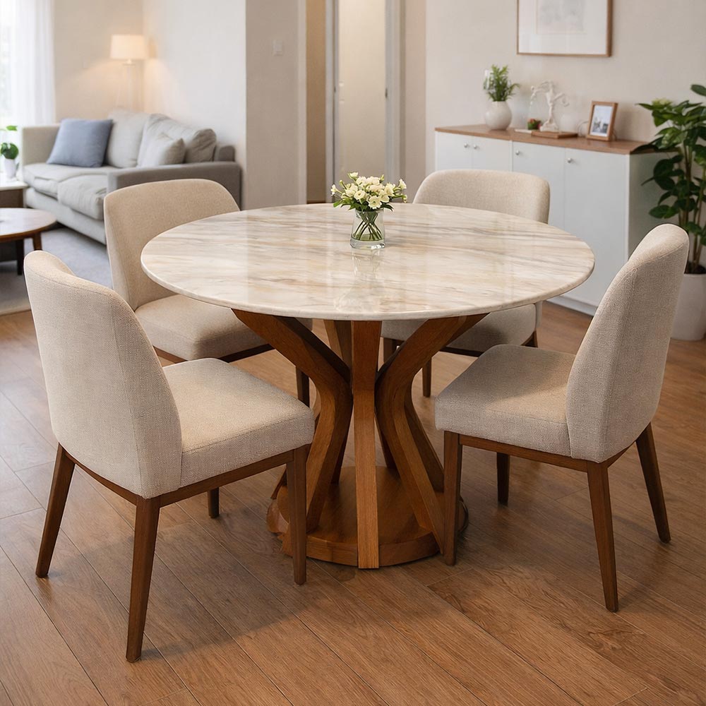 Al tratarse de una piedra natural, se recomienda limpiar con paño suave ligeramente húmedo, evitando productos abrasivos o químicos agresivos. Con el mantenimiento adecuado, la mesa conservará su belleza y elegancia durante muchos años.