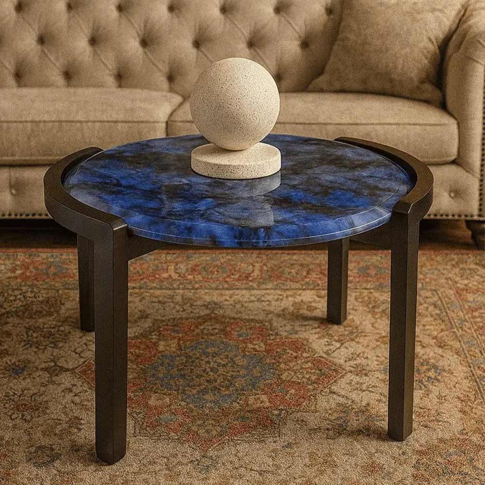 La mesa Zafiro Night destaca por su tablero de mármol natural en tonalidades azul noche, cuyas vetas suaves generan una estética profunda y sofisticada.
