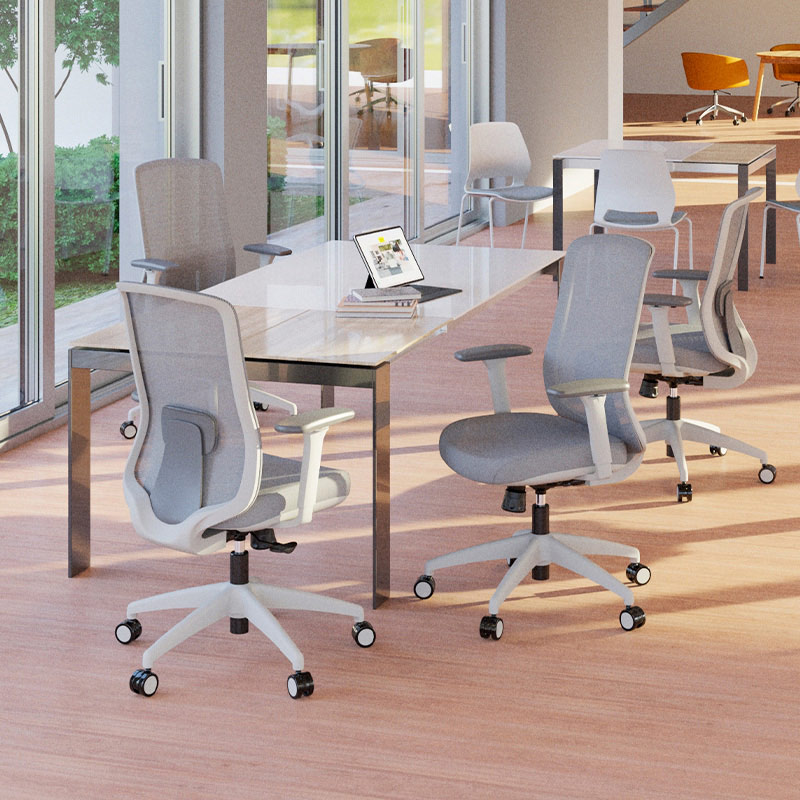 La silla Milano Gerente es una solución funcional y resistente para espacios de trabajo innovadores, integrando espaldar en malla de poliéster con apoyo lumbar regulable para una postura saludable, brazos 3D en polipropileno que se ajustan en altura y ángulo, y asiento inyectado tapizado en tela que aporta firmeza y confort; su mecanismo syncro con tres posiciones de bloqueo y control de tensión garantiza una respuesta ergonómica precisa, mientras que la base de nylon con ruedas de poliuretano asegura una movilidad fluida y silenciosa.