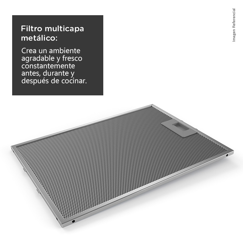 De instalación a pared, la DW67LM50 combina elegancia y rendimiento compacto. Con 3 + 1 velocidades (1 intensiva) y una potencia de extracción de 646 m³/h, ofrece eficiencia superior. Sus filtros multicapa con cubierta de acero lavables en lavavajillas, filtro de carbón y doble instalación (extractora o recirculante) la convierten en una opción moderna, con un nivel de ruido de 61 dB.
