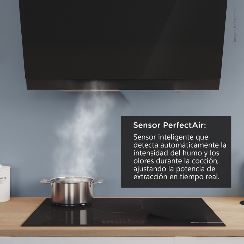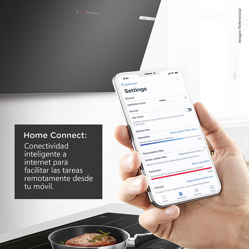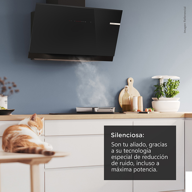 De instalación a pared, esta joya en vidrio negro combina estética y tecnología. Con HomeConnect y Control encimera - campana, ofrece sincronía perfecta con tu encimera Bosch. Sus 3 + 2 velocidades alcanzan una potencia intensiva de 1007 m³/h, con filtros multicapa de acero lavables en lavavajillas y opción de filtro de carbón. Silenciosa (51 dB) y versátil, puede instalarse como extractora o recirculante.