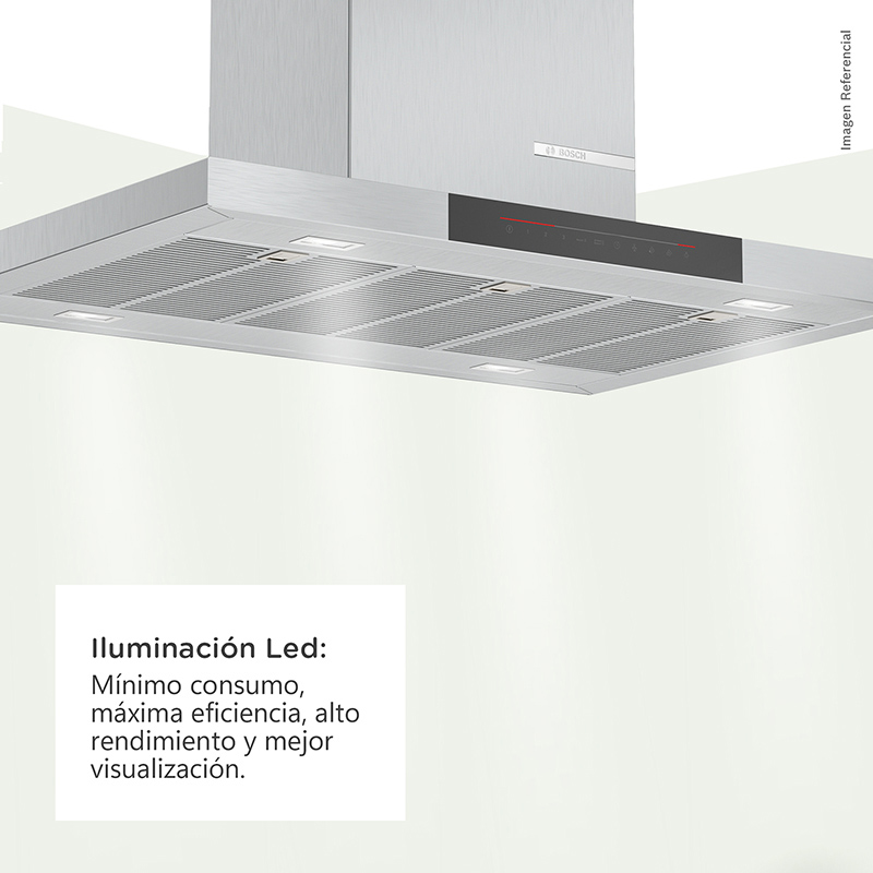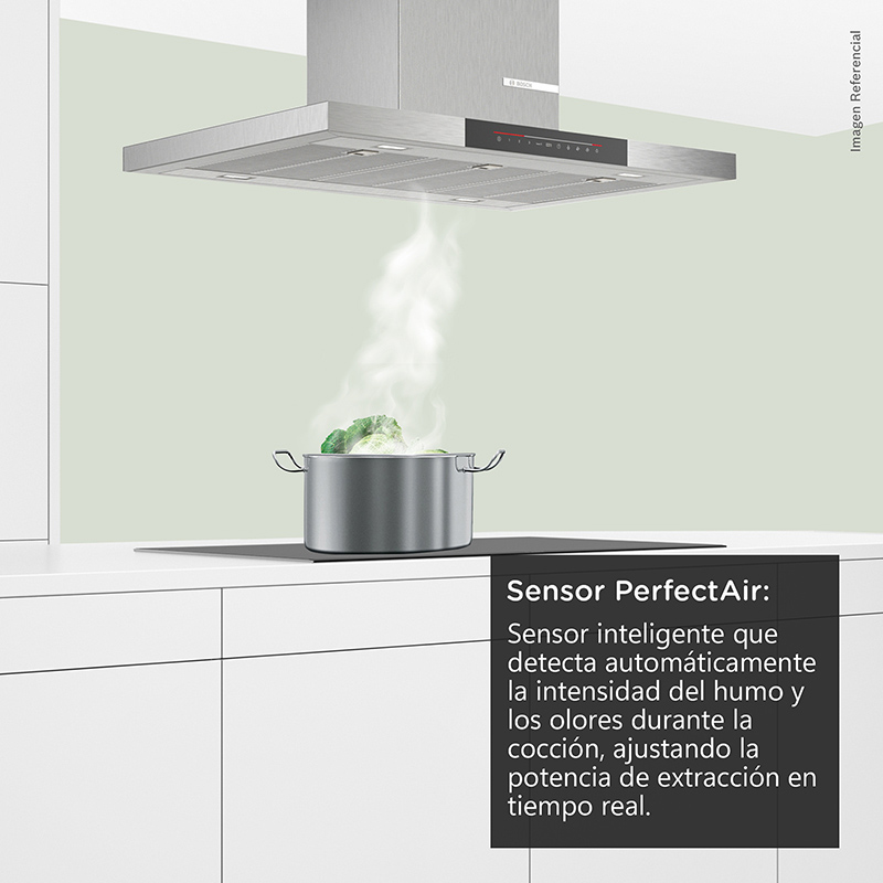 De instalación tipo isla, la campana decorativa Bosch DIB98JQ50 combina elegancia y tecnología. Su sensor PerfectAir ajusta la potencia automáticamente (3 + 2 niveles) según la intensidad de cocción, alcanzando hasta 867 m³/h de extracción. Sus filtros multicapa con cubierta de acero lavables en lavavajillas, opción de filtro de carbón y nivel sonoro de solo 54 dB garantizan pureza y confort, tanto en modo extractor como recirculante.