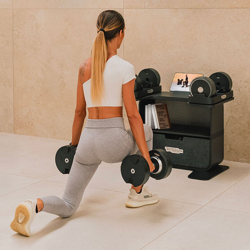 12 mancuernas en 1 mancuerna conectada con sugerencias de carga personalizadas que se adaptan a tu rendimiento y tus métricas.